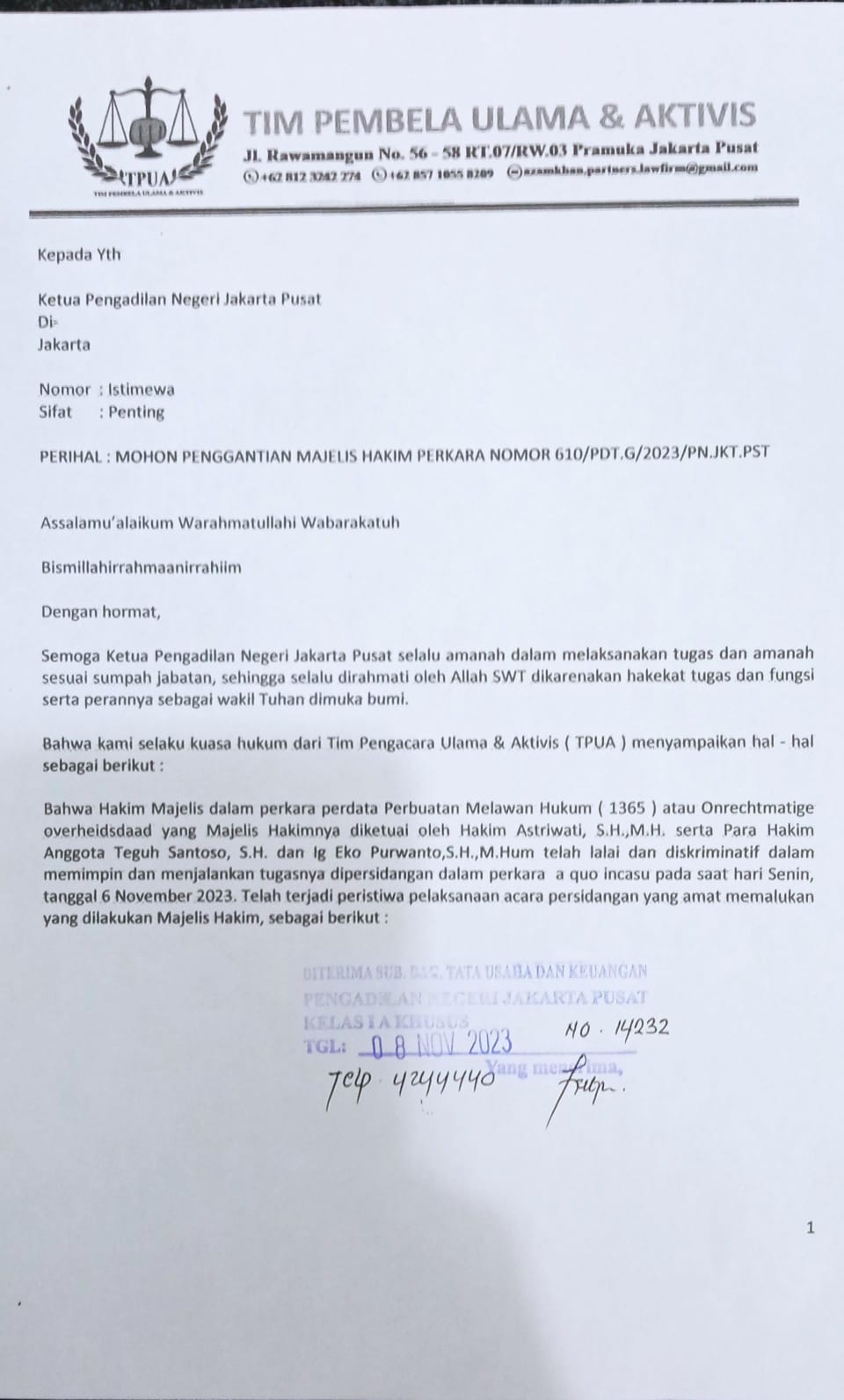 Disetrap.com- Tim Pengacara Pembela Ulama & Aktivis melayangkan surat permohonan penggantian majelis hakim pada nomor perkara 610/PDT.G/2023/PN.JKT.PST. Surat yang dilayangkan…